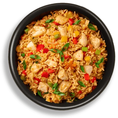Wok-tossed basmati rice with spiced chicken/shrimp, veggies, and desi flavors&side of gravy